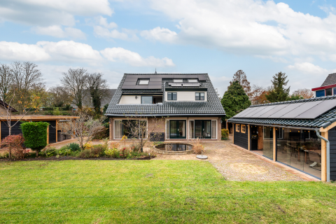 De achtertuin is een echte eyecatcher en heeft een fijne zonligging op het noordwesten. De tuin is prachtig aangelegd met mooie betegeling, diverse verhoogde bakken met sierbeplanting en een sfeervolle vijver. Het geheel is weelderig begroeid en biedt veel privacy en groen, waardoor het een heerlijke plek is om te ontspannen of gezellig te genieten van een lange zomeravond.